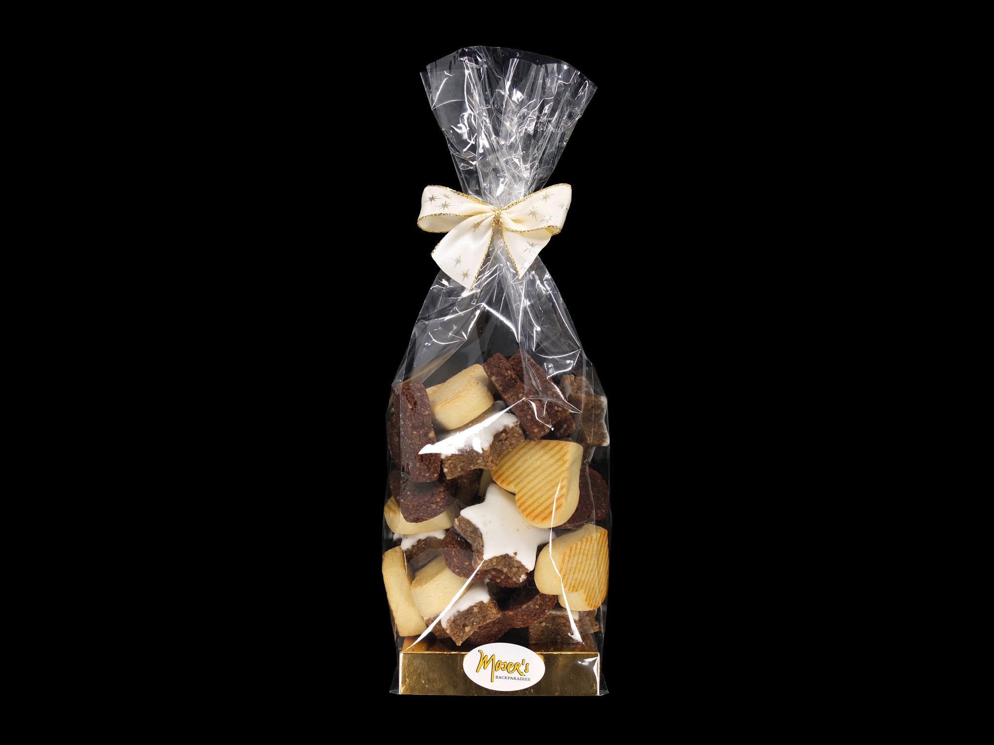 Brunsli (Mandeln, Zucker, Kakaomasse, Feuchthaltemittel: Sorbitol, Eiweiss (aus Bodenhaltung), Zimt), Zimtsterne (Haselnüsse, Zucker, Eiweiss, Feuchthaltemittel: Sorbit, Zimt, Zitronenaroma: Wasser, Alkohol, natürliche Aromen, Verdickungsmittel (E415), Säurungsmittel (E330), Konservierungsmittel (E202)), Mailänderli (Weizenmehl, Butter, Zucker, Vollei (aus Bodenhaltung), Zitronenaroma (Wasser, Alkohol 14.8%, natürliche Aromen, Verdickungsmittel (E415), Säuerungsmittel (E330), Konservierungsmittel (E202)), Salz)
